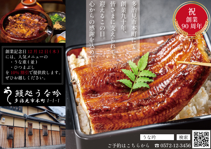 うなぎ屋チラシ コンセプト 架空のうなぎ屋の創業周年記念のチラシです。 うなぎの写真を中心に、黒色をベースにして落ち着いた雰囲気になるようデザインしました。 ・ターゲット層 地元の常連客を中心に全世代・作成時間 1日・使用ソフト illustrator 2025年1月20日 投稿先 DTP - 印刷物 ← 過去の投稿へ 次の投稿へ → コメントを残す コメントをキャンセルメールアドレスが公開されることはありません。 ※ が付いている欄は必須項目ですコメント ※ 名前 ※ メール ※ サイト 次回のコメントで使用するためブラウザーに自分の名前、メールアドレス、サイトを保存する。